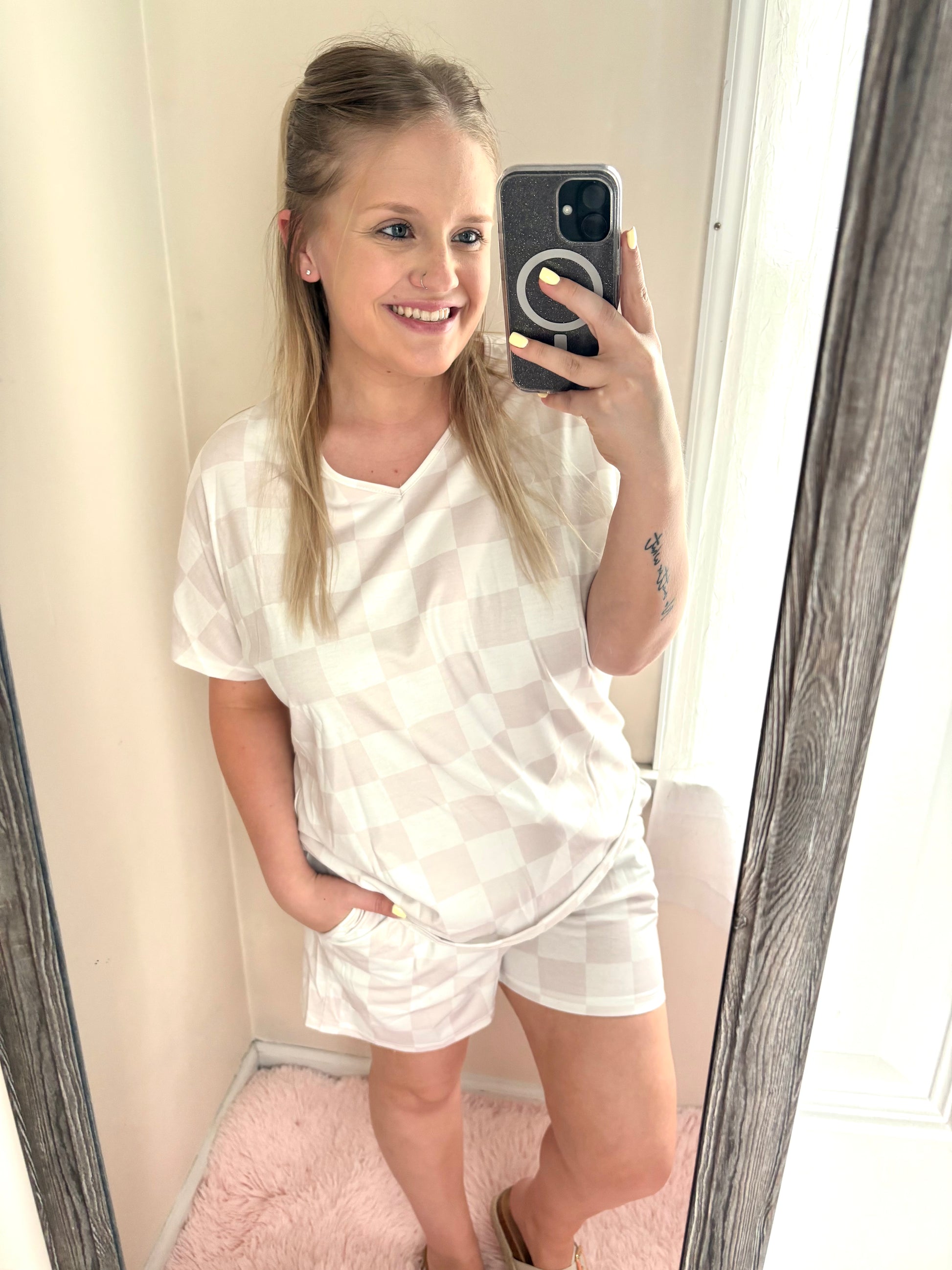 This lounge set for ladies is concise but chic in style. It features fashionable checkered pattern on the tee and shorts. The v neck t shirt is regular fit while the shorts have a drawstring waistline and pockets. This two-piece set is soft and breathable with fine quality.