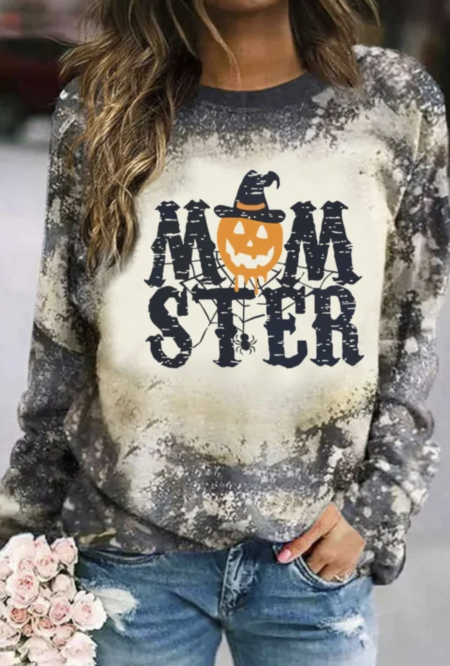 Get in the Halloween spirit with this tie-dye top. The "MOMSTER" print and pumpkin pattern create a festive atmosphere. Versatile and stylish, pairs well with pants, jeans, shorts, or a skirt. Made with high-quality fabric for ultimate comfort and durability.